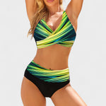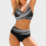 Este biquíni de duas peças combina padrão geométrico moderno com um design pensado para valorizar a silhueta. O top cruzado com decote em V oferece excelente suporte e realce ao peito, enquanto a cueca de cintura subida garante conforto e um efeito modelador subtil. Ideal para mulheres que procuram estilo, segurança e um toque de originalidade nas idas à praia ou à piscina.