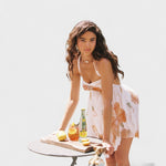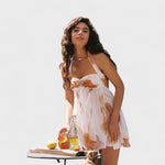 O Mini Vestido Floral irradia pura romantismo – com delicadas flores em tons pastel, um decote halter e camadas de chiffon leve que caem de forma encantadora. Perfeito para festas no jardim, brunches de verão ou um copo de rosé ao sol.