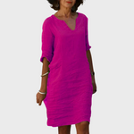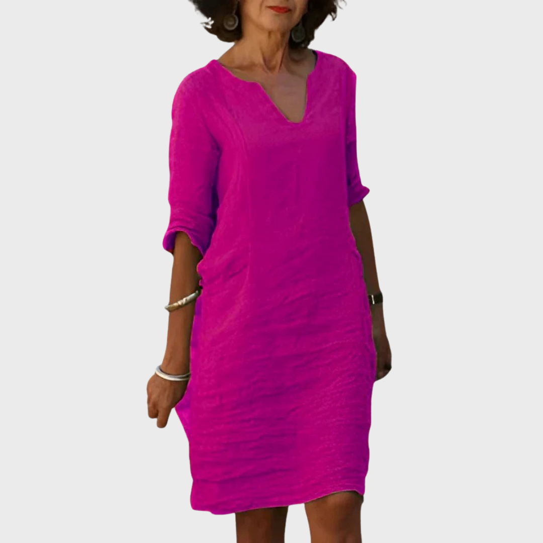 O Vestido Elsa combina elegância intemporal com conforto leve para todas as ocasiões. Com decote em V e mangas 3/4 fluídas, cria uma silhueta feminina e descontraída — ideal para dias de trabalho, saídas casuais ou jantares especiais.