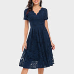 Este vestido é feito para momentos importantes. Com o seu lisonjeador decote em V, delicada sobreposição de renda floral e silhueta em A fluida, é ideal para casamentos, festas de cocktail e noites elegantes. As mangas curtas acrescentam um toque de sofisticação, enquanto os pormenores com vieiras o tornam chique sem esforço.