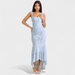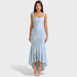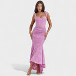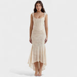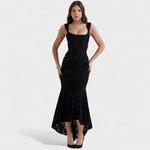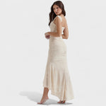 Romantična silueta haljine utjelovljuje bezvremensku eleganciju svojom nježnom čipkom i dizajnom koji laska silueti. Savršena je za vjenčanja, vrtne zabave ili bilo koju prigodu koja zahtijeva dašak decentne sofisticiranosti.