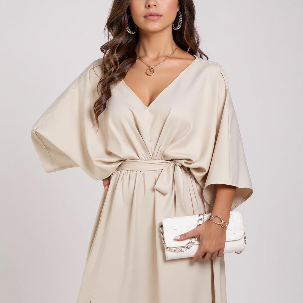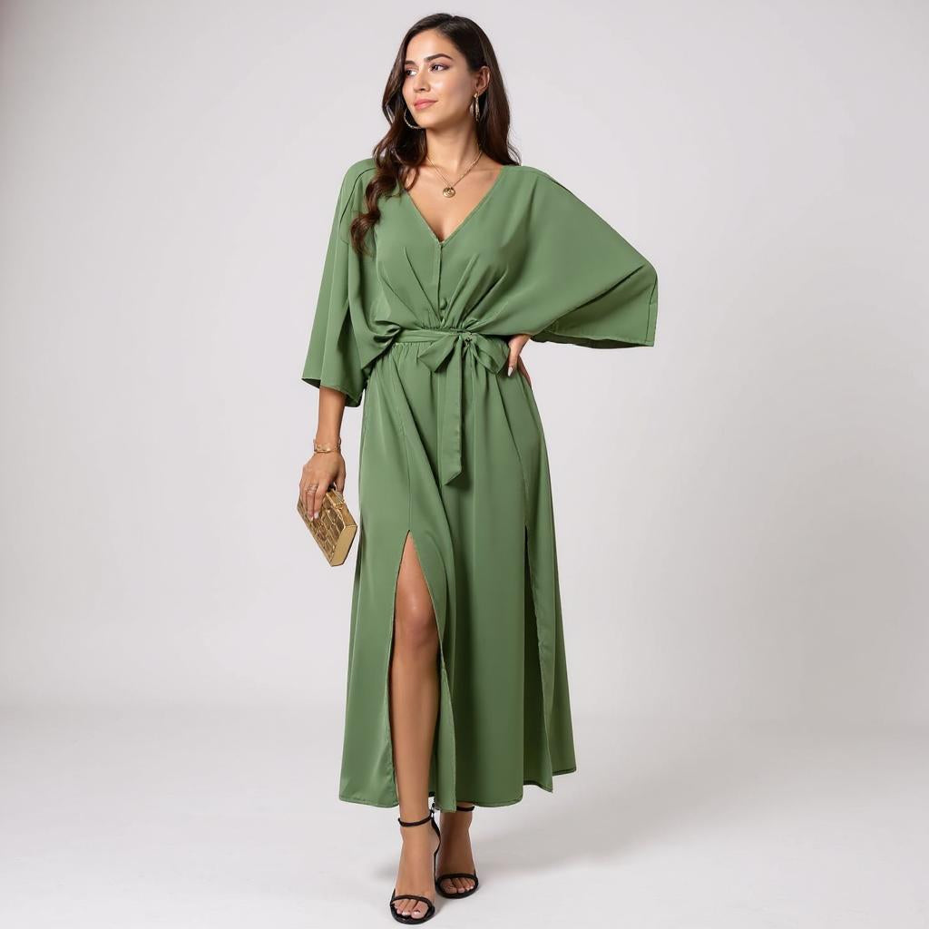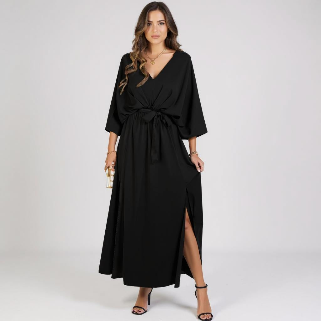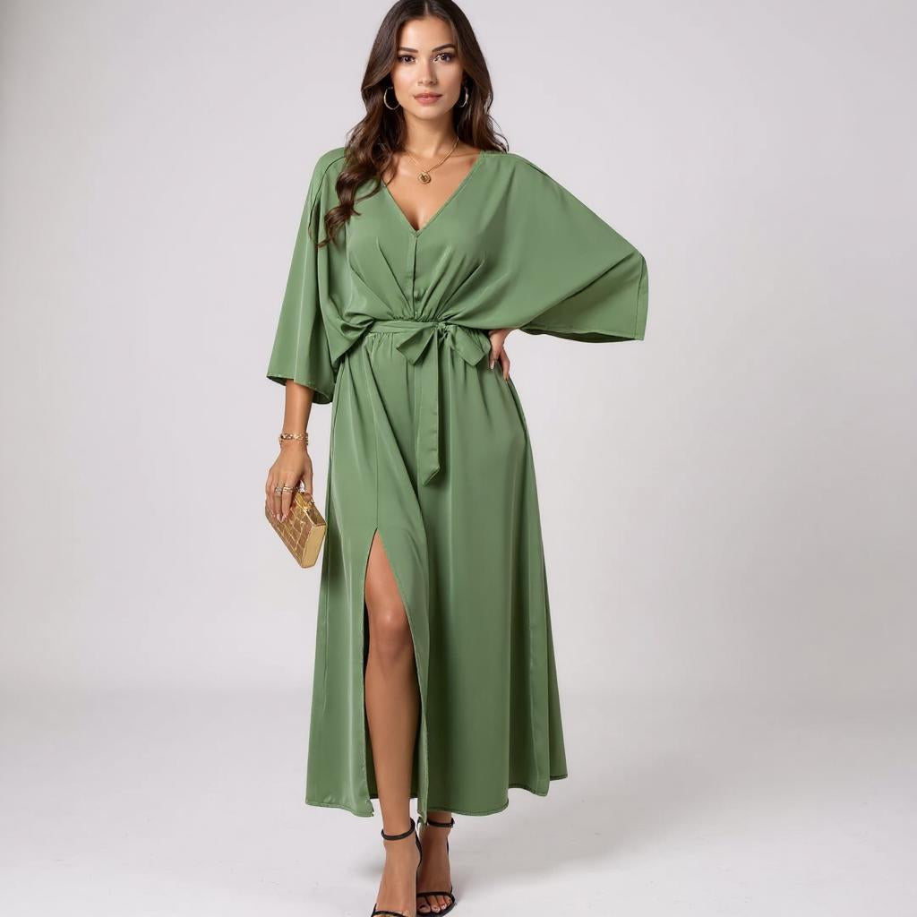 Découvrez une robe qui incarne le charme et la confiance. Sa coupe élégante à col en V et sa fente subtile mettent délicatement votre silhouette en valeur, tandis que la ceinture à nouer souligne la féminité et l’élégance naturelle. Parfaite pour les occasions officielles, les dîners romantiques ou chaque moment où vous souhaitez vraiment briller.