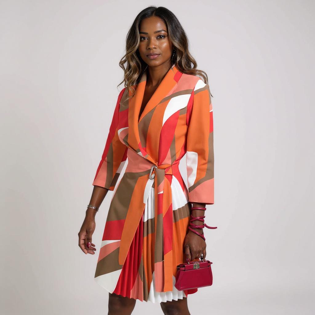 Tento model dokonale spojuje klasický vzor s moderním střihem a ženskými detaily. Horní část připomíná sako se zavinovacím efektem a páskem v pase, zatímco spodní část přechází do jemně plisované sukně, která vytváří elegantní a nadčasový look. Ideální volba pro obchodní schůzky, společenské akce i stylové každodenní nošení.